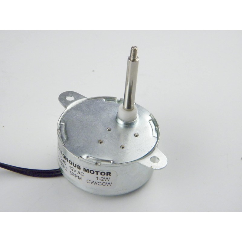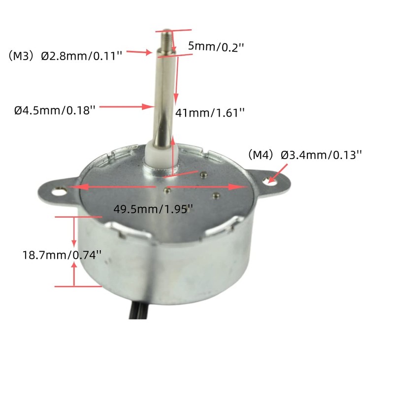 - 【TYC-40 AC Synchronous Motor Parameters:】Size: 4.2cmX4.2cmX1.7cm ; Voltage: 12V AC; Speed: 5r/min ; Shaft length: 74mm; Shaft screw thread inner diameter:M3,(Φ2. 8mm); Mounting hole diameter: M4 (φ3.4mm); Frequency: 50/60Hz ; Power: 1-2W ; Torque: ≤0.5kg.cm ; Rotation: CW/CCW(not controllable).