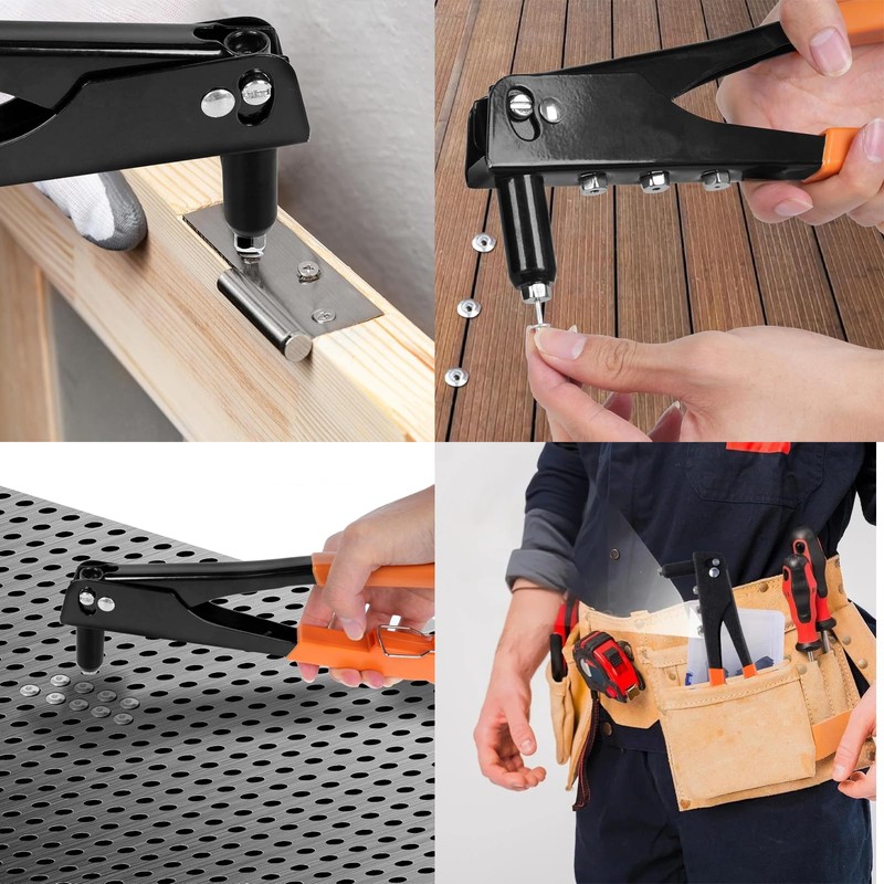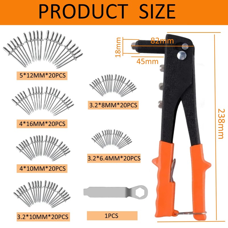 ChaneeHann Blind Rivet Pliers with Rivet Pliers Set, 120 Metal Rivets for Aluminium Rivets, 4 Attachments + Ratchet, Wall Mounting, Orange