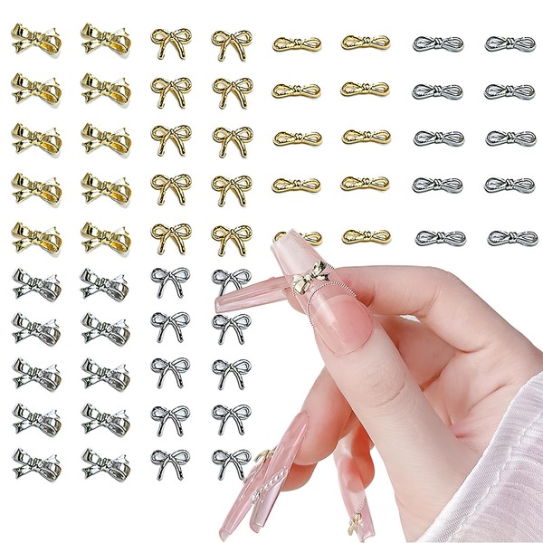 CHANGAR 60 Stück 3D-Nagelkunst-Anhänger mit Schleife, Gold/Silber, Nagel-Anhänger aus Metalllegierung, süße Fliege, Nagelkunst-Schmuckzubehör für DIY-Nagelkunst, Bastel-Dekoration