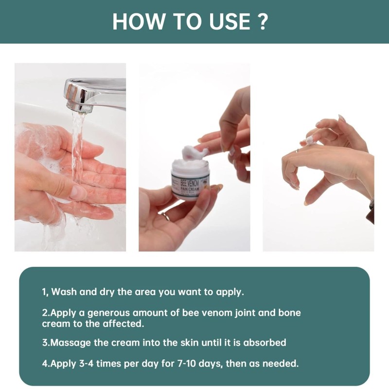 - How to use-- First wash and dry the area you want to apply, apply a generous amount of bee venom joint and bone cream to the affected, massage the cream into the skin until it is absorbed.Apply 3-4 times per day for 7-10 days, then as needed.
