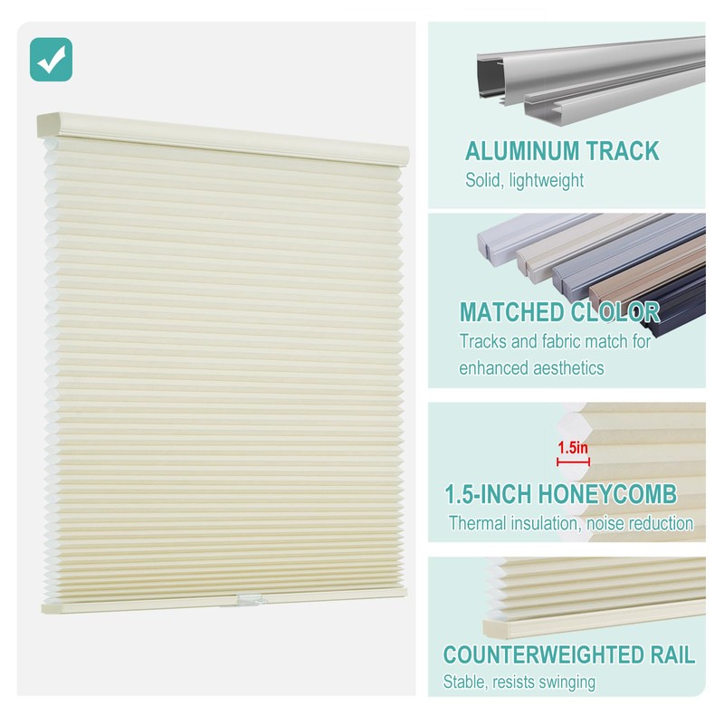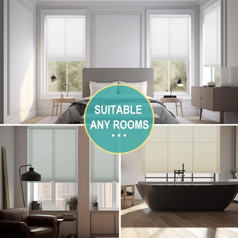 - Safe and Smooth Operation:The cordless design of these honeycomb blinds ensures child and pet safety. The upgraded spring system, tested over 5,000 times, offers smooth operation without jams and maintains any position for perfect light and privacy control.