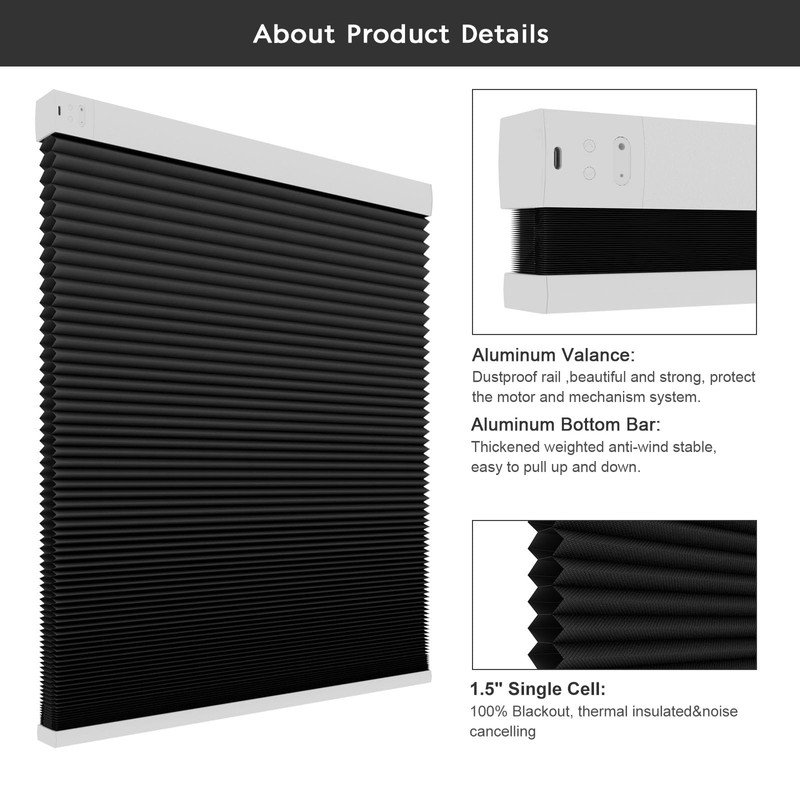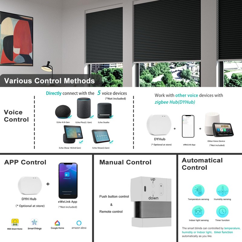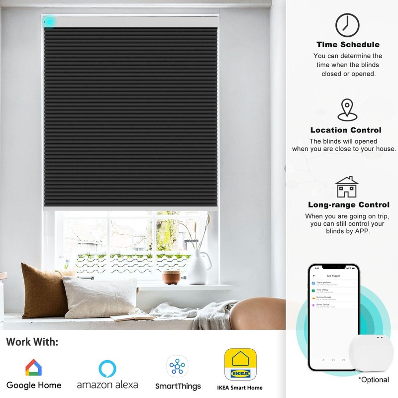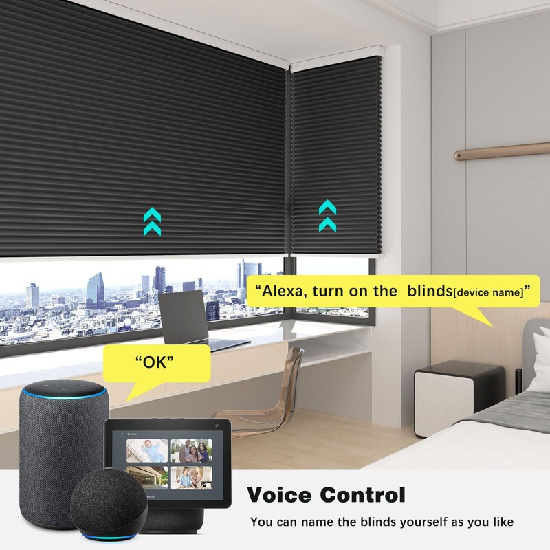 • Convenience: This Smart Cellular Shades can directly work with 5 Versions' Alexa. (Echo Plus 2nd Gen, Echo Show 2nd Gen, Echo Studio, Echo Show 10, Echo 4th Gen), App and voice control, can be controlled from anywhere in the world through an internet connection, using smartphones or other networked devices such as a smart speakers.
