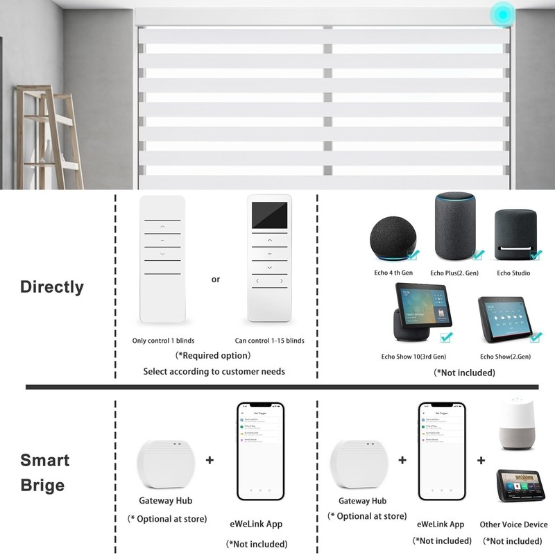 • Work With Alexa: Our Custom Motorized Blinds with Remote can directly work with 5 Versions' Alexa without bridge or hub. (Echo Plus 2nd Gen, Echo Show 2nd Gen, Echo Studio, Echo Show 10, Echo 4th Gen), you can say your commands to these Alexa directly to make the smart blinds pull up or down. Other Alexa need bridge or hub to automatic control.