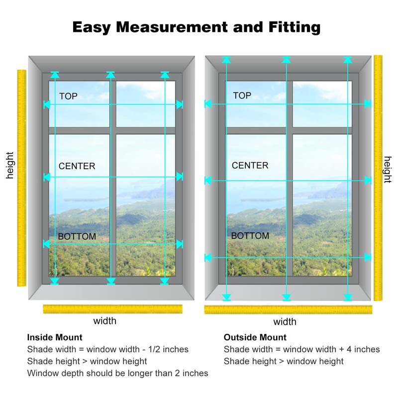 - EASY TO INSTALL: Includes all the hardware you will need with simple instructions to make installation easy and convenient! For inside mount, the shade width should have a 1/2 inch deduction to fit inside your window frame. For the outside mount, add 3-4 inches to your window opening width for better window coverage