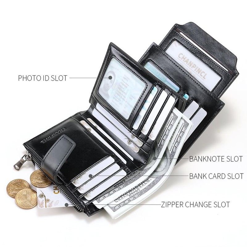CHANPINCL mens buckle, zipper, leather wallet, detachable card, large capacity, multi-functional coin pocket (Oil wax black)