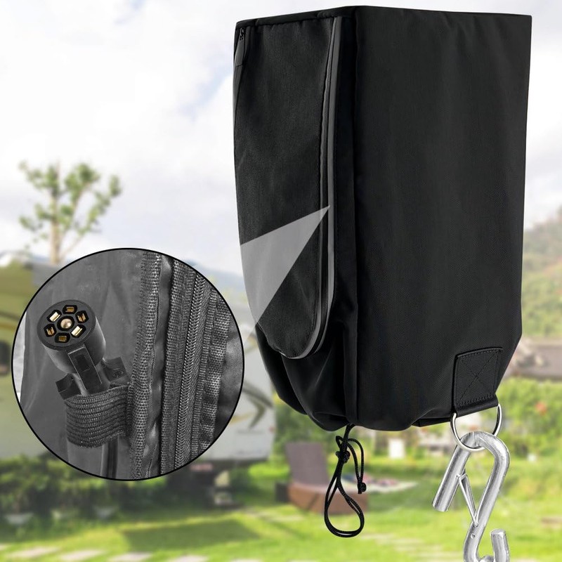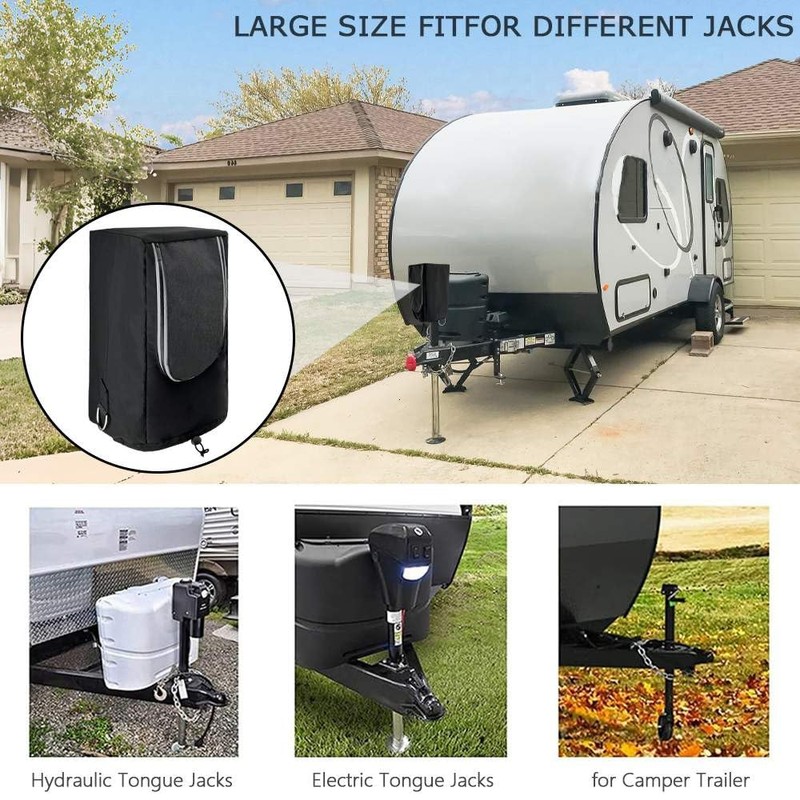 - Universal: The RV jack cover with D rings measures 18 x 9 x 7.5 inch and is suitable for most electric tongue jacks. It comes with an adjustable drawstring and convenient zipper, making it easy to install and fixed tightly, and also easy to remove.