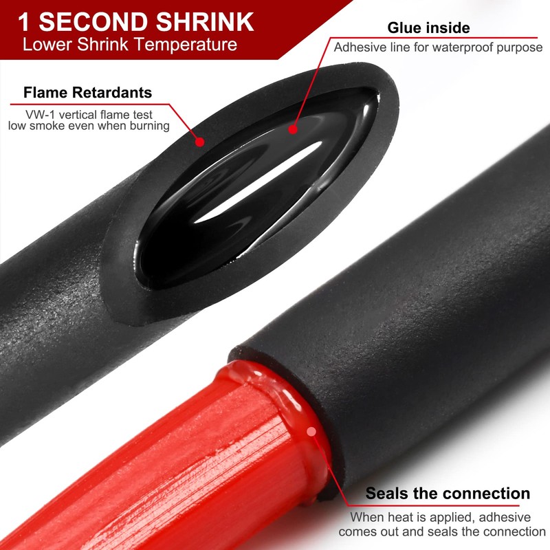 - DOUBLE WALL TUBING - Take out the anti-adhesive paper inside then apply heat, adhesive comes out and seals the connection, creating marine grade waterproof insulation, corrosion resistance water & oil proof, VW-1 Flame Retardants, High temperature resistance 3/1 shrinkable glue inside wire.