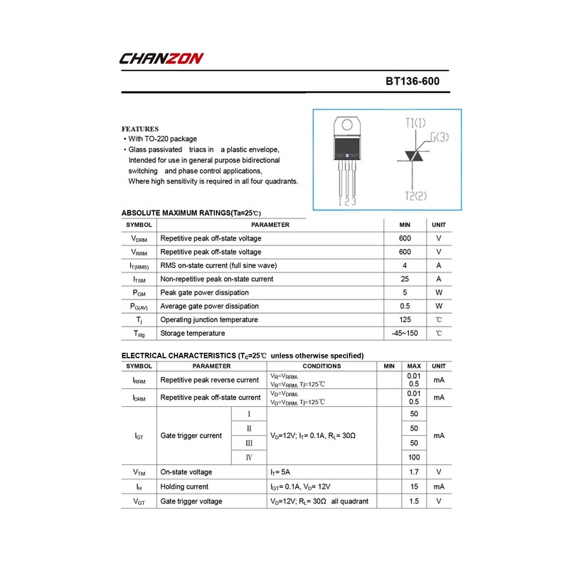 - Triac Thyristor Type: BT136-600, designed for medium power electronic devices.