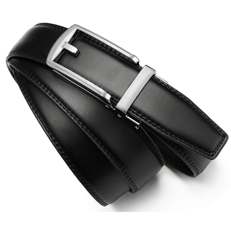 - EASY TO USE - Slide the black dress belt for men into the sliding buckle, and the holeless belt auto-locks. Lift the automatic buckle, and pull the mens belts leather to release. Simple, smooth, and sleek!