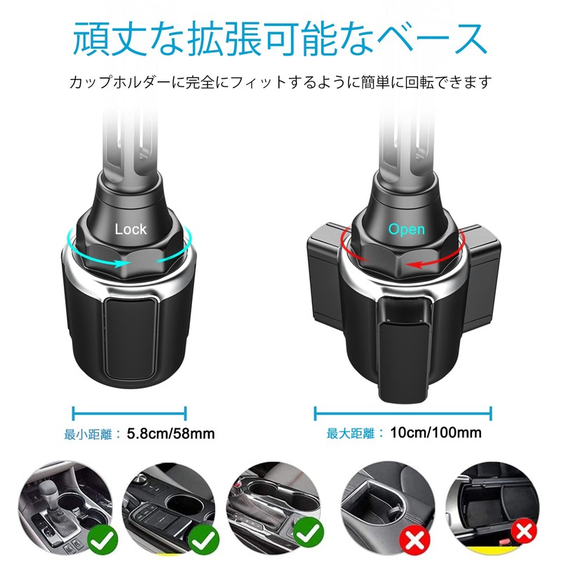 - 【Adjustable Sturdy Base】Sturdy adjustable base ensures stability. Cup holder tablet car mount fits most standard cup holders from 58mm to 100mm, preventing your device from swinging during your hard drive, making calls, maps, and hassle-free charging