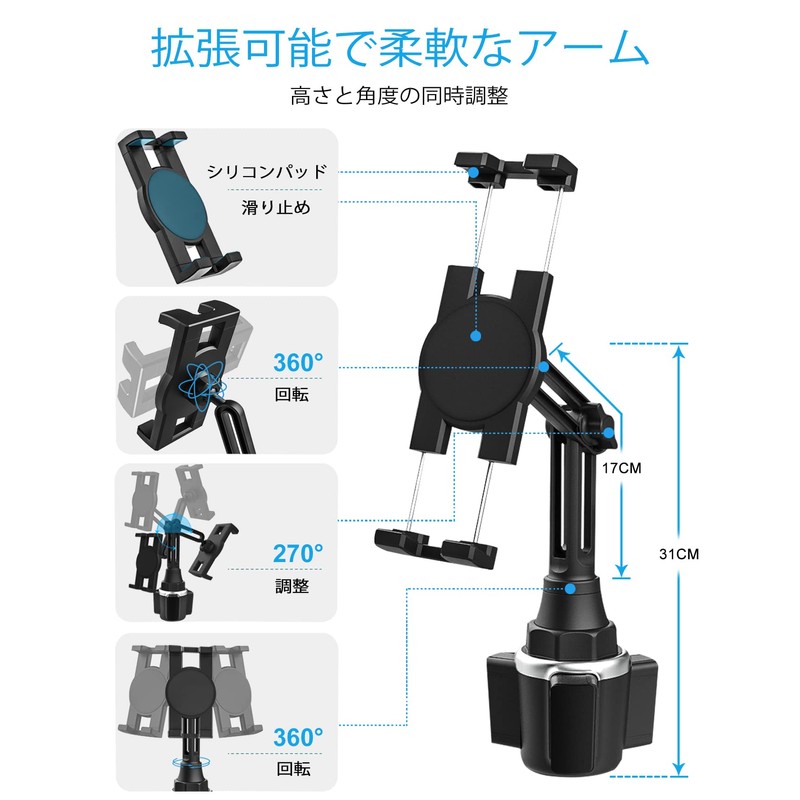 Charchendo Car Holder Tablet Cup Holder Car Drink Holder Tablet Cell Phone Stand Car Cup Holder Mount 360 Degree Rotation Freely Adjustable Telescopic Arm Stability Japanese Instruction Manual