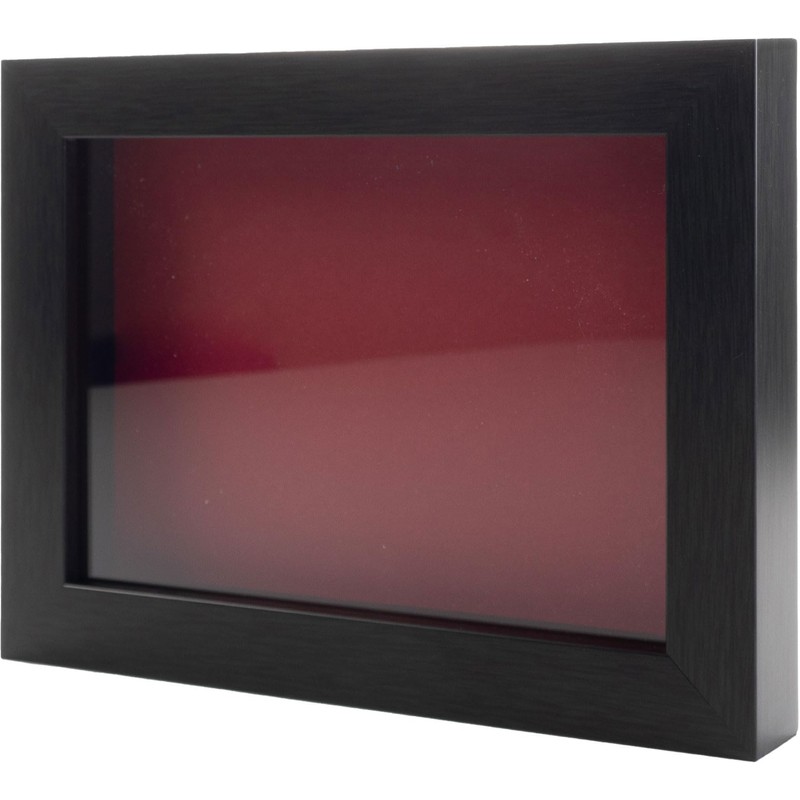 Charcoal wood shadow box with interior dimensions of 11x14 inches. Includes frame-grade UV-resistant acrylic front and hanging hardware. Featuring an acid-free red backing to help protect your photos and keepsakes. The usable depth of this shadow box is 3/4". Great for weddings, birthdays, and displaying collectibles.