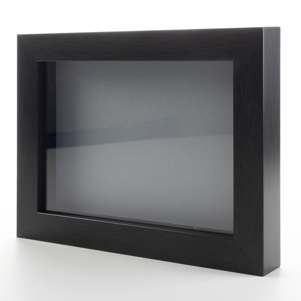 Charcoal wood shadow box with interior dimensions of 20x24 inches. Includes frame-grade UV-resistant acrylic front and hanging hardware. Featuring an acid-free grey backing to help protect your photos and keepsakes. The usable depth of this shadow box is 3/4". Great for weddings, birthdays, and displaying collectibles.