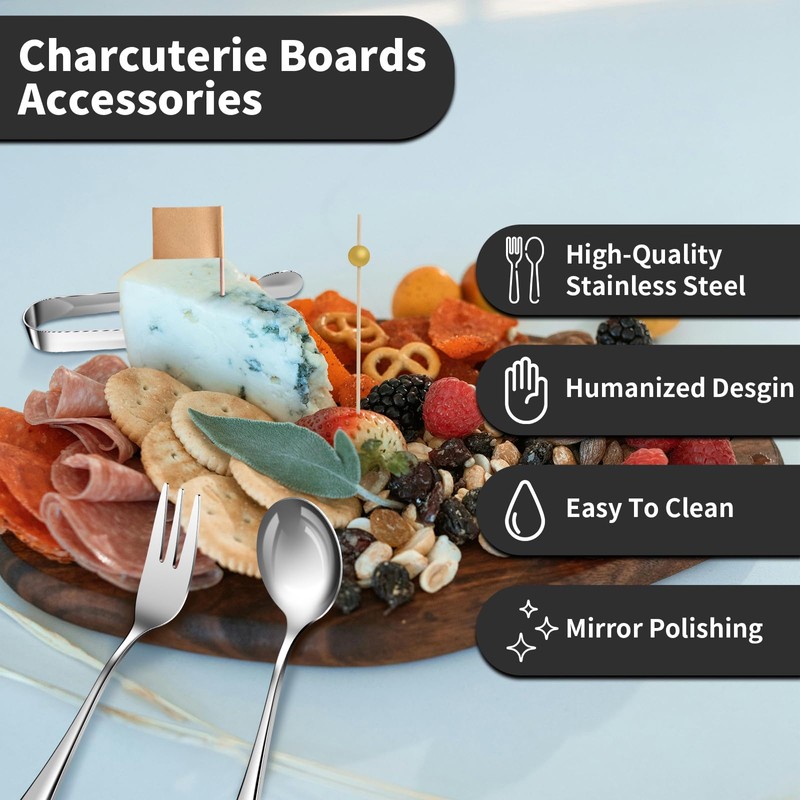 - 【Wide Applications】These charcuterie accessories are perfect for any gathering! The versatile spoons, forks, and tongs are ideal for serving coffee, desserts, yogurt, ice cream, appetizers, sauces, condiments, sugars, and more. They are excellent with charcuterie board, very suitable for daily life, picnic, barbecue party and so on.