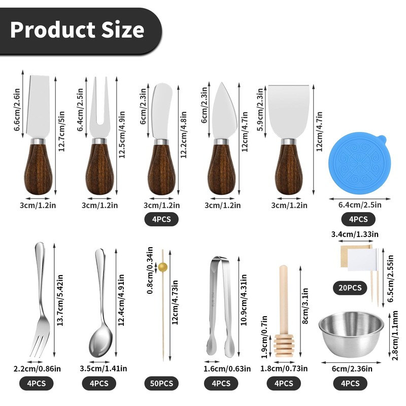 - 【Charcuterie Boards Accessories Gift Box Packaging】The set includes 8 butter knives, 4 charcuterie bowls, 4 mini forks, 4 small spoons, 4 mini pliers, 4 wooden honey spoons, 20 toothpick flags, and 50x cocktail picks. They are excellent with charcuterie board, very suitable for daily life, picnic, barbecue party and so on