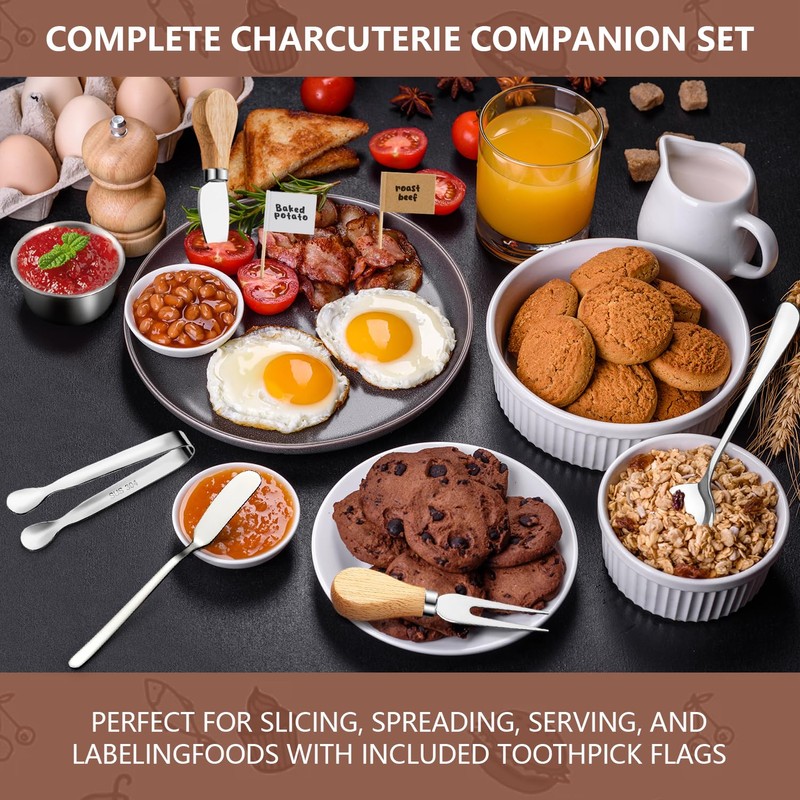 - 【Versatile Charcuterie Tools】Butter knives and spreader knives for cutting and spreading cheese, butter, jams, and peanut butter. Serving tongs for sugar cubes, ice, lemon slices, pastries, desserts, boiled eggs, and appetizers. Spoons and forks for tasting various foods. Dipping bowls for condiments, jams, honey, and desserts. Toothpick flags for marking cheese, butter, and charcuterie items. Perfect for charcuterie boards, parties, daily use, grazing, appetizers, picnics, and barbecues.