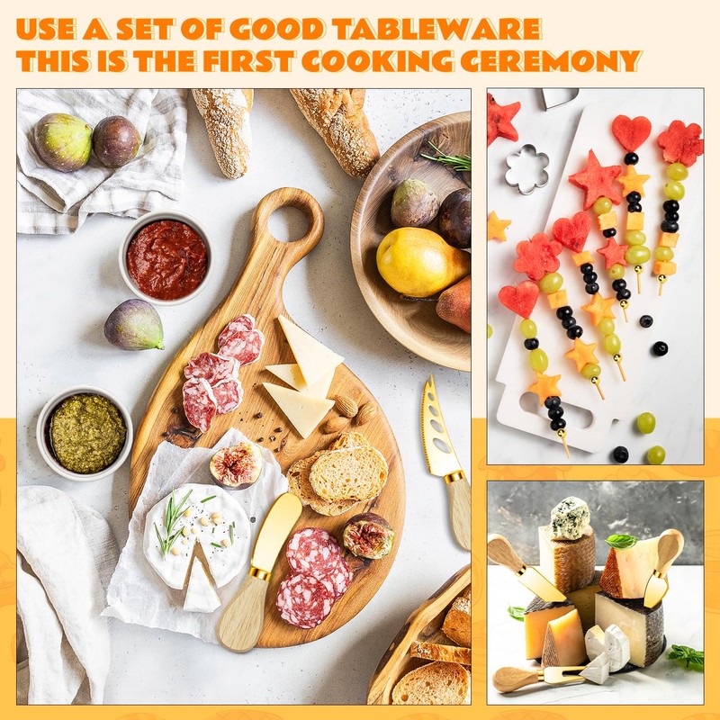 - 【Versatile Charcuterie Tools】Cheese spreader knives for cheese, butter, jams, and peanut butter. Serving tongs for sugar cubes, lemon slices, pastries, and appetizers. Spoons and forks for tasting various foods. Dipping bowls for condiments, jams, honey, and desserts. Toothpick flags for marking cheese and deli items. Cocktail picks are ideal for skewering fruits, cheese cubes, deli meats and appetizers. Perfect for charcuterie boards, parties, grazing, picnics and barbecues.
