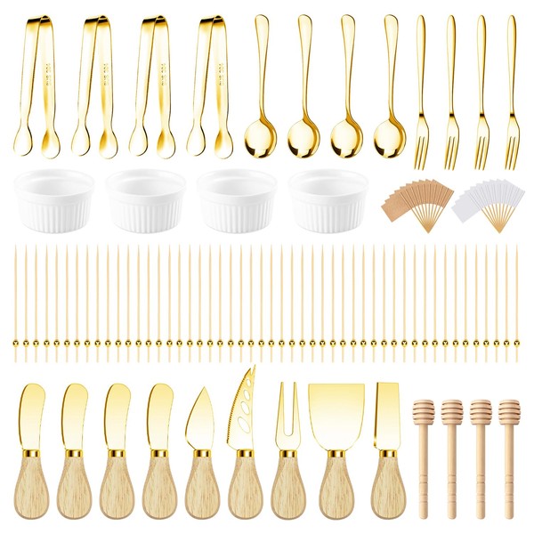 - 【Gold Charcuterie Utensil Set Includes】The cheese butter spreader knives set includes 9 cheese knives (6 types), 4 mini serving tongs, 4 small spoons, 4 small forks, 4 mini dipping bowls, 4 honey dippers, 40 toothpick flags and 100 cocktail picks. Perfect for preparing cheese, butter, jams, appetizers, and pastries. This set is sufficient to meet your daily or entertaining needs.