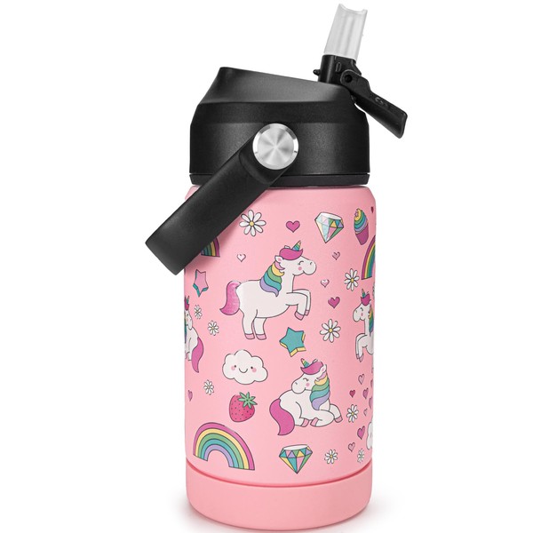 Charcy 12 oz Insulated Water Bottle With Straw, Sports Water Cup Flask with Wide Mouth, Leak Proof Travel Thermo Mug - Pink Unicorn S