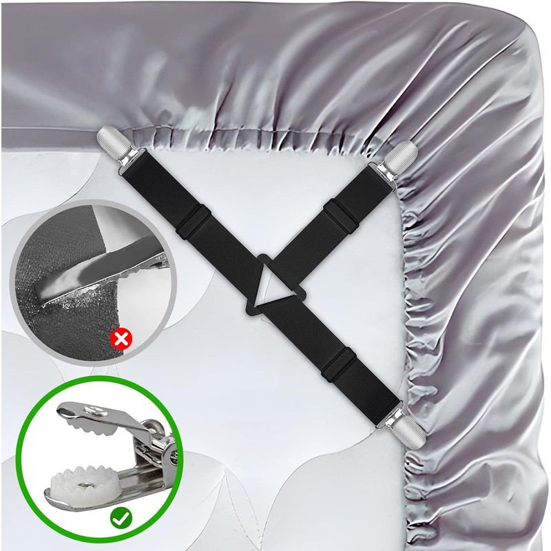 • 【Easy installation】 Fasten 3 clips at corner of your sheets, Repeat above for all 4 corners and flip the fitted corner back down over the mattress, Adjusting the tension on the straps. They will grip your bed sheets firmly and keep your bed looks tidy at all times. Enhance your sleeping experience, no more loose sheets in the middle of the night