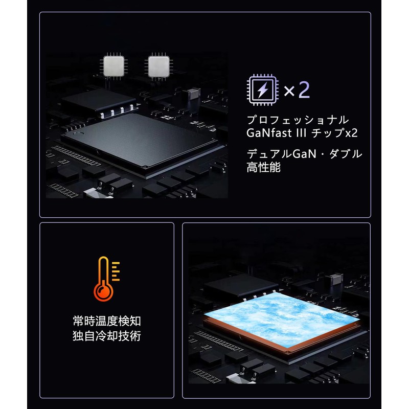 - (Uses Double GaNFast III Chips) Adopts two advanced GaNFast III chips and combined with a unique cooling safety technology to boost the power density limits and improve efficiency. Through reduced energy use and a smaller footprint we have achieved faster design and lower heat generation of the system. The Ministry of Environment has implemented the "GaN Technology Decompression Society and Lifestyle Leading Innovation Business with GaN Technology" to utilize high-quality Galium Nitride (GaN) to thoroughly reduce energy loss in all aspects of society, and achieve reduced CO2 emissions