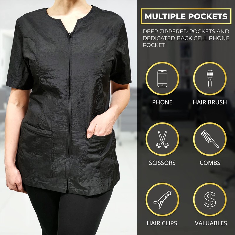 - EASY AND CONVENIENT WEAR: Featuring a practical zipper closure on the front, this jacket offers easy and convenient wear. The zipper closure ensures a secure fit throughout the day, enabling hairstylists to move freely and confidently during their busy work hours. Whether they are attending to clients or engaging in various salon activities, this jacket will remain securely fastened, providing the wearer with peace of mind and allowing them to focus on their craft.