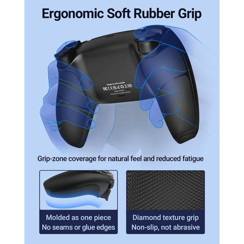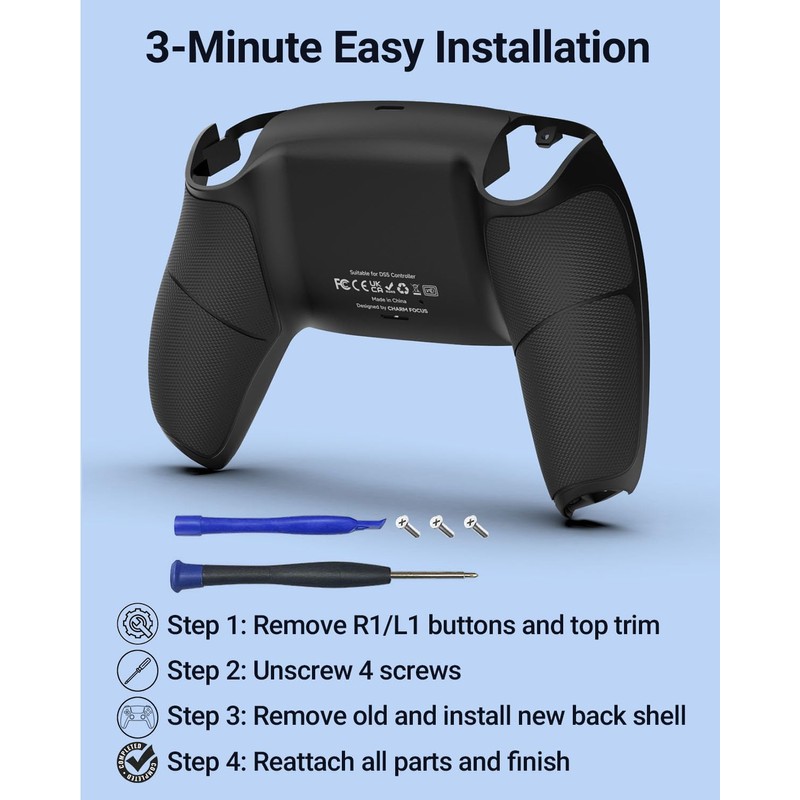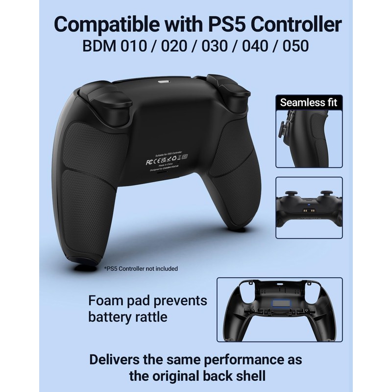 CHARM FOCUS Back Shell Grip Cover for PS5 Controller, Soft Rubber Overmold and Anti-Slip Diamond Texture, Seamless-Fit Replacement PS5 Controller Shell, Black CHARM FOCUS Back Shell Grip Cover for PS5 Controller, Soft Rubber Overmold and Anti-Slip Diamond Texture, Seamless-Fit Replacement PS5 Controller Shell, Gray Seamless Fit: Custom replacement back shell for PS5 controller; precision-cut for a snug fit; ensures original-level performance and usability Soft Rubber Overmold: Features an integrated soft rubber grip; no glued edges or lifting; the soft rubber covers the grip area with ergonomic design for comfortable, fatigue-reducing hold Anti-Slip Diamond Texture: Soft rubber grip with custom diamond pattern; delivers reliable non-slip performance and supports precise, consistent control during gameplay Easy Installation: Takes only 3 minutes to install; no technical skills required; all tools included for quick setup; step-by-step video available on the detail page Package Includes: 1*Back shell, 1*pry tool, 1*screwdriver, and 3*spare screws; controller and other parts are not included