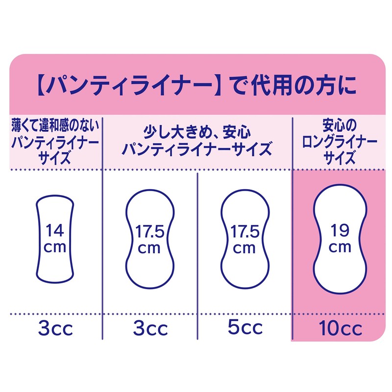 - Absorption: 0.3 fl oz (10 cc); Length: 7.5 inches (19 cm); Size Guide: Long panty liner size