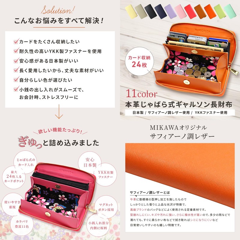 - Mikawa women's wallet series. Italian Saffiano leather is very popular in Europe and America. We have released the latest Japanese-patterned fabric jabara style in accordance with customer requests. This long wallet is the perfect gift for Mother's Day