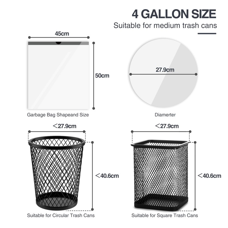 - Perfect fit – The size of Charmount small plastic 4 Gallon garbage bags is 17.7’’W x 19.7’’H(45x50cm).These drawstring bags are suitable for 1.2, 2, 2.6, 3, 4, 5 gallon (10-15L) capacity trash can.