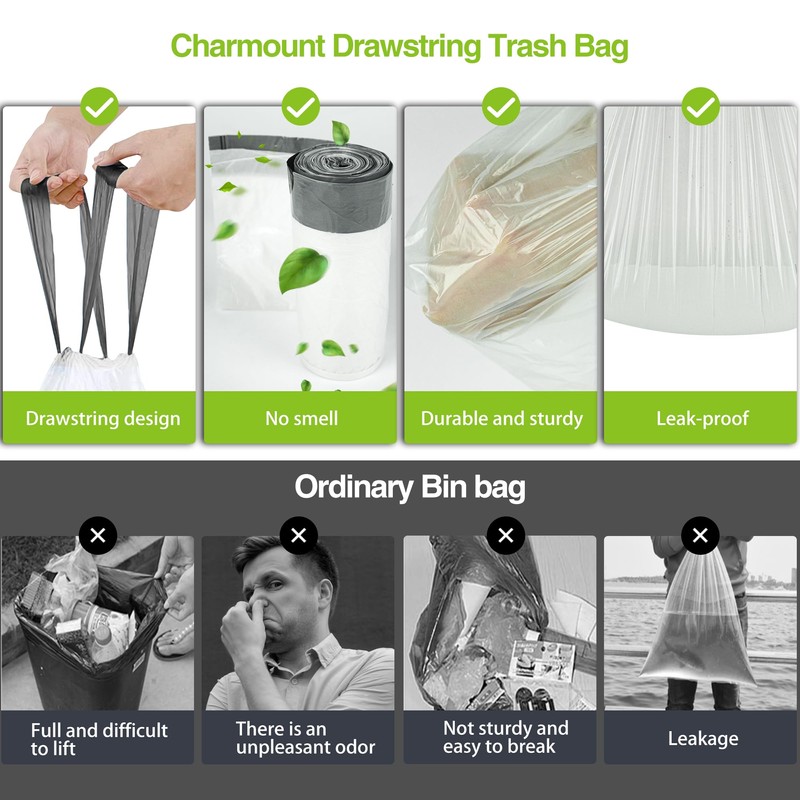 - Drawstring Closure - To reduce spillage and scattering of garbage, this mini garbage bag is designed with strong drawstring ties make it easier in daily use. Just 3 steps Tighten, lift, and throw out