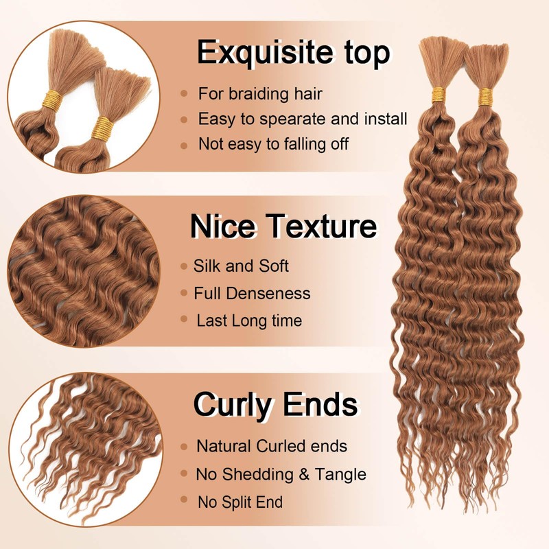 - 2.Advantages: This Deep Wave Bulk Hair for Braiding is incredibly soft, smooth,Pre-Stretched Smooth Ends; No Smell & No Itch, No Tangles & No Shedding; No Weft; Skin-Friendly, and easy to manage, closely resembling natural hair.