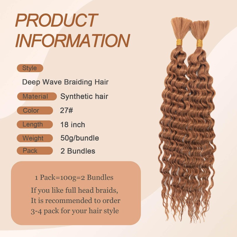 - 3.Length and Weight:The Weight of Deep Wave Bulk Hair is 50g Per Bundle.Depending On Your Needs, If You Like Full Head Braids, We Recommend You Purchase 6-8 Bundle. One Pack Has Two Bundles, The Weight of Single Bundle is 50g.