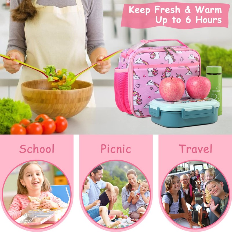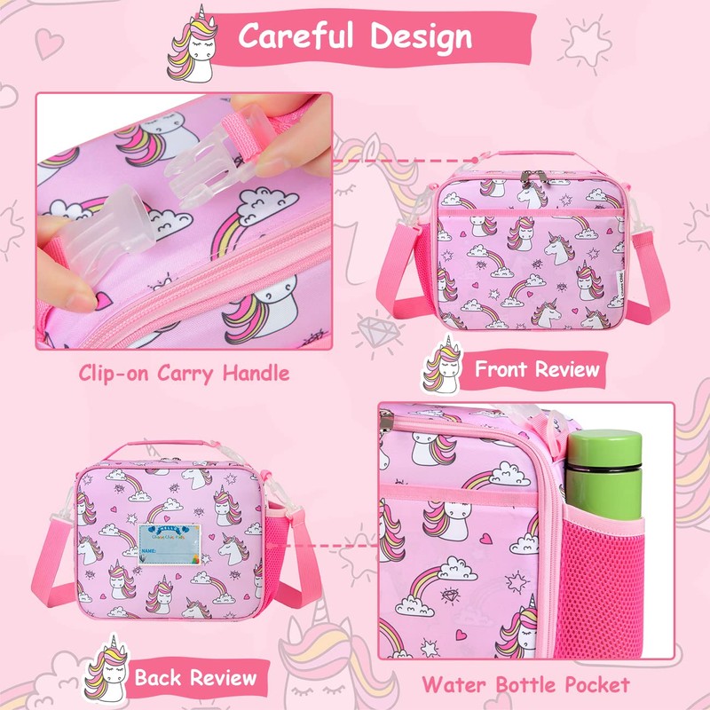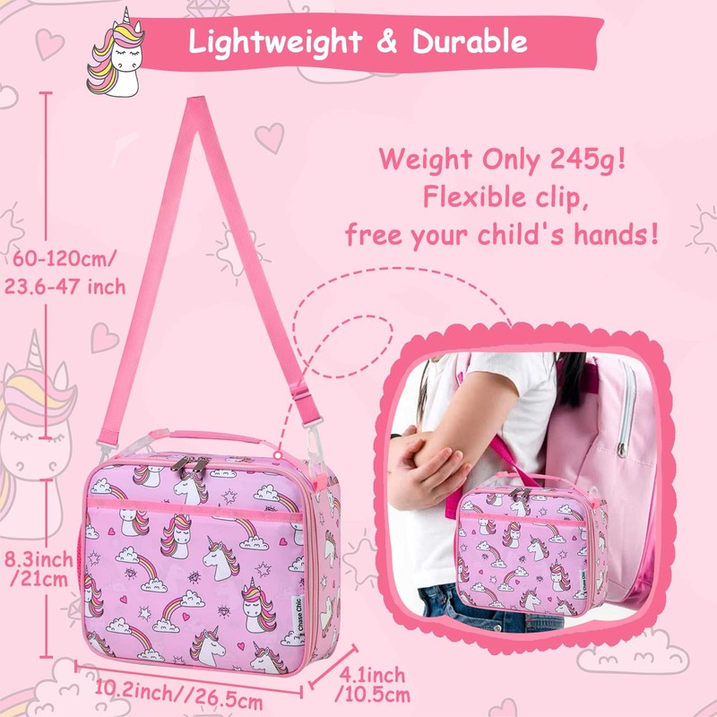 - 🦄LOVELY DESIGN: Chasechic kids lunch bag is designed by unique cute pattern and intimate details. Made from waterproof polyester fabric, this lightweight lunch bag is foldable and could wash by machine. The interior is insulated with high-density insulation and has an insulating/freshness function to keep food/drinks fresh. This long-lasting kids lunch box will accompany with your little sweetheart for a meaningful childhood and their childlike heart.