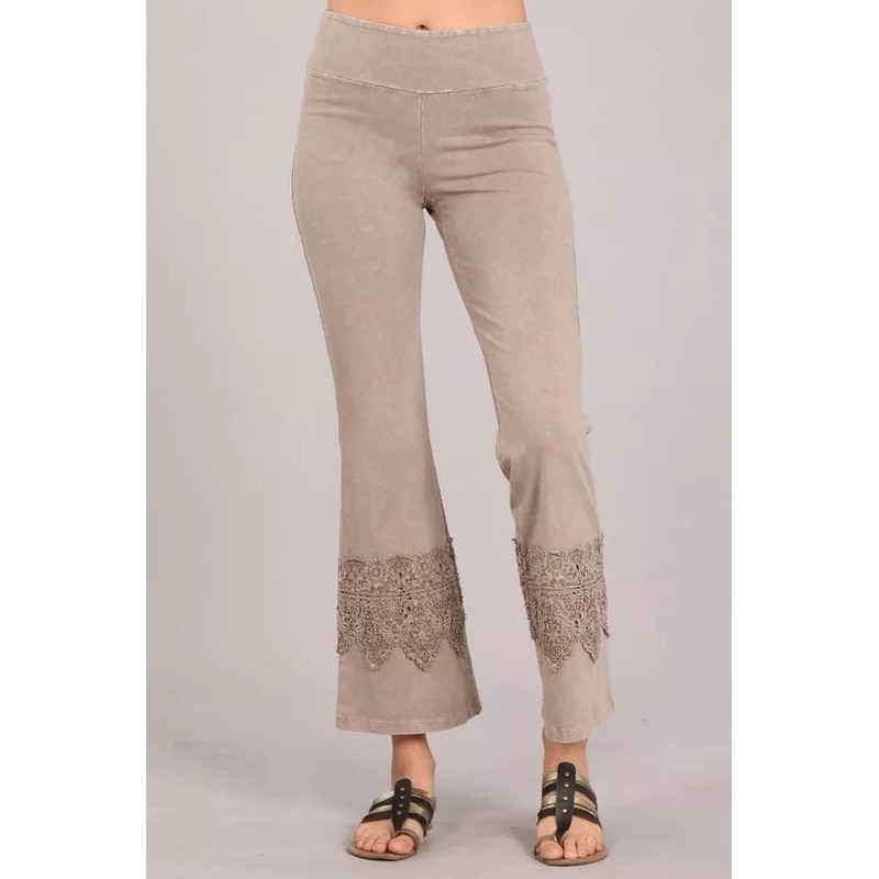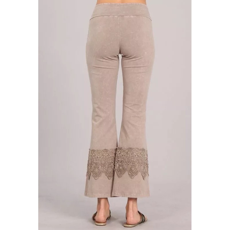 Chatoyant mineral wash flared stretch pants with wide lace trim detail with a smooth banded waist in a slightly cropped length.