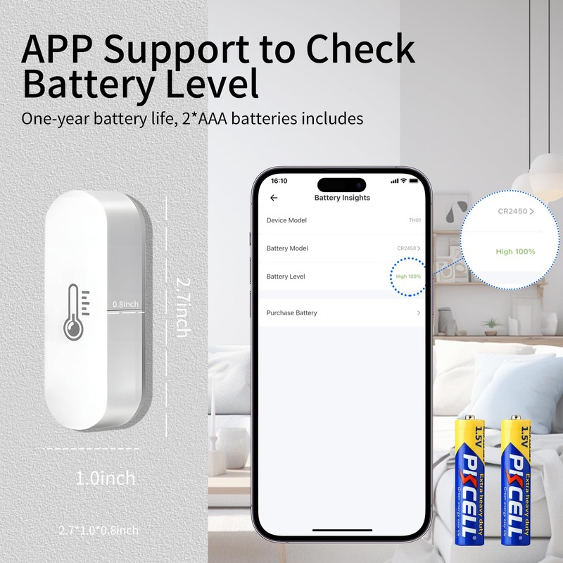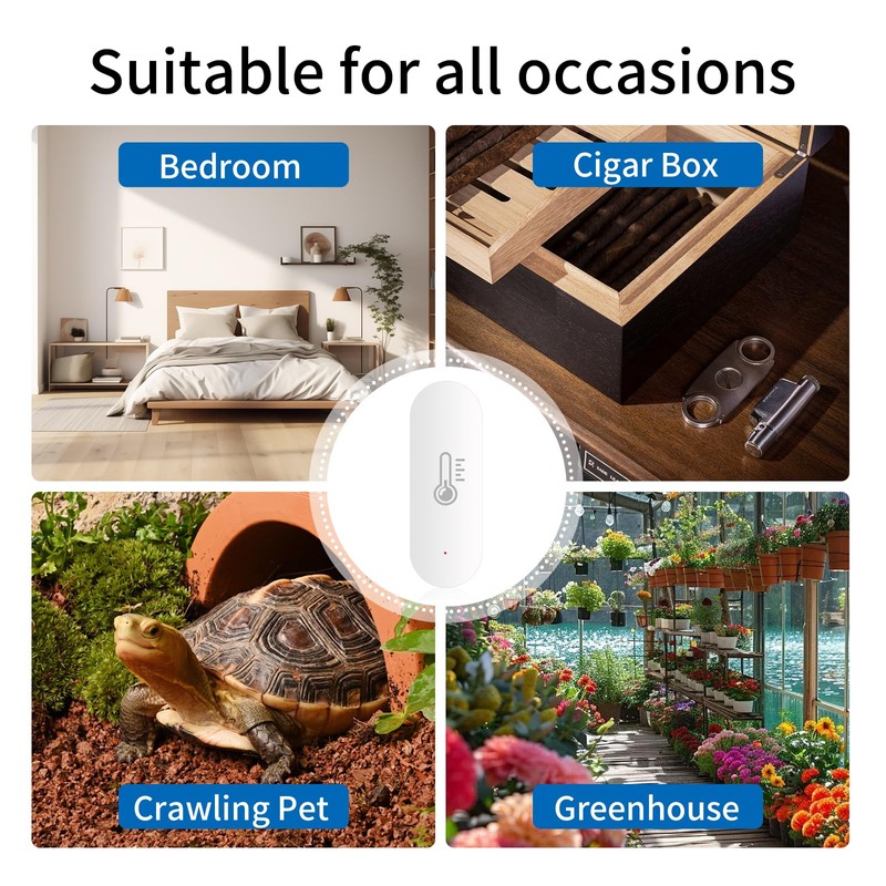 - Intelligent notification: set the temperature and humidity range in the app, if exceeded, the app immediately sends a warning message. Create a comfortable environment for your home, pets and greenhouse.