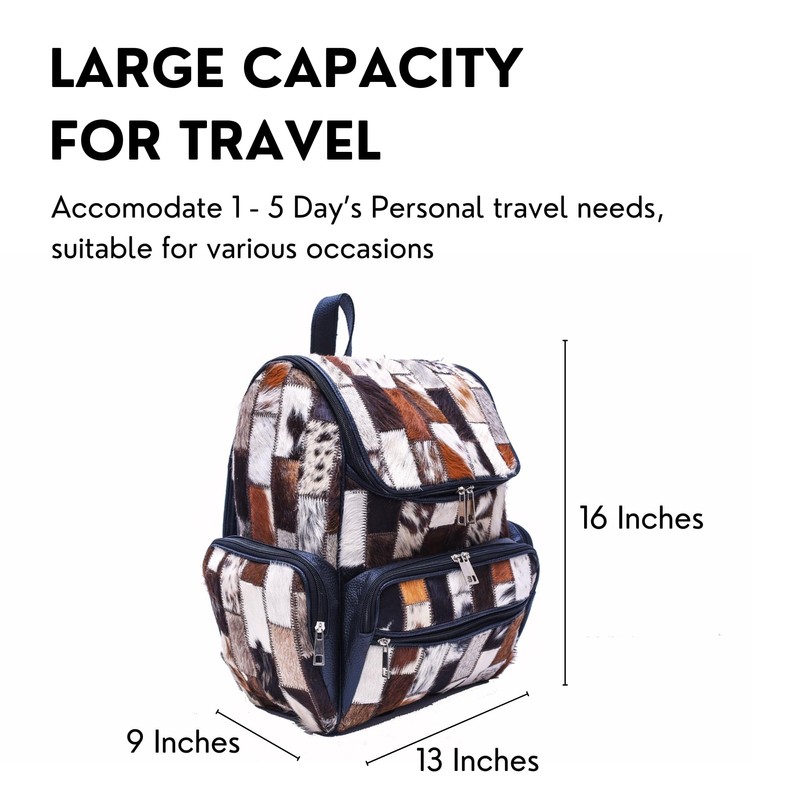 - [DISCLAIMER] - Each organic cowhide backpack is unique due to natural variations in color, texture, and markings, which prove the hide's authenticity. Expect slight color differences from photos, and colors may change with time and use. Natural patches or imperfections are part of the genuine hide. By purchasing, you acknowledge and appreciate these natural qualities.