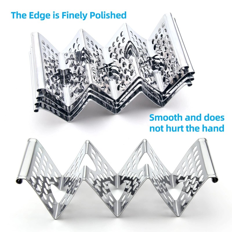 • High Quality Stainless Steel: The taco tray is made of stainless steel material, which is very strong and robust and will not bend or deform. They will keep the tortillas upright, whether they are sitting on a plate or baking in the oven.