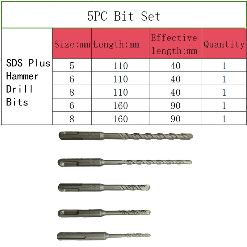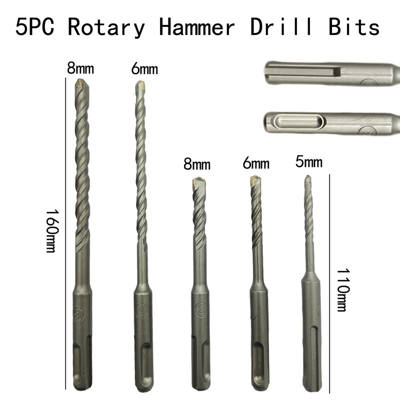- [COMPLETE SET] - This 5pcs sds plus bits set includes 5 drills bitswith 5 mm,6 mm, 8 mm, which deliver the durability and performance you need to carry out all kinds of heavy duty brickwork, including chiselling, chasing and demolition