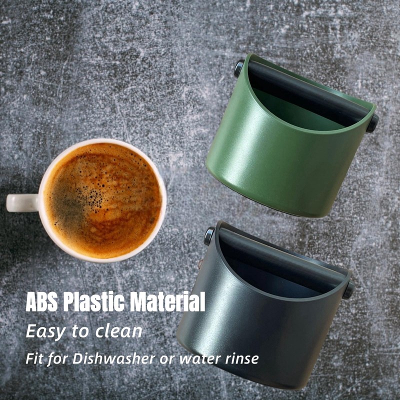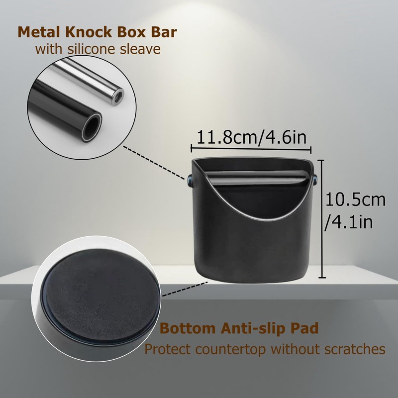 - Easy to Clean--Plastic material coffee knock box body, coffee grounds are easy to pour out. Easy to clean the interior of Espresso knock box. Just rinse under the tap. and the anti-slip pad on the bottom of the puck box prevents sliding when the surface is wet and won't leave marks on countertop.