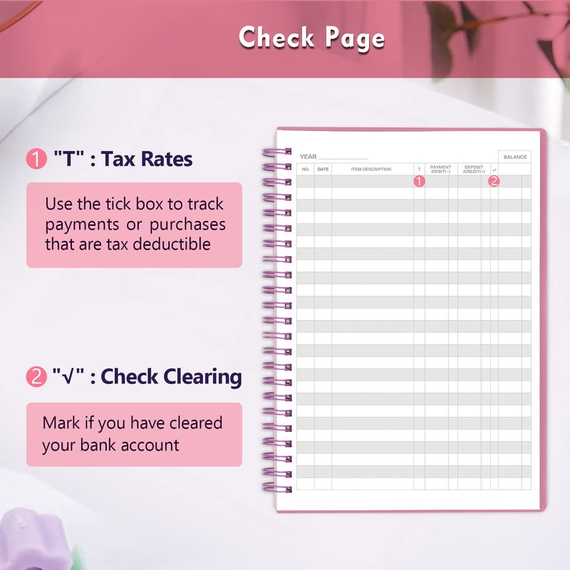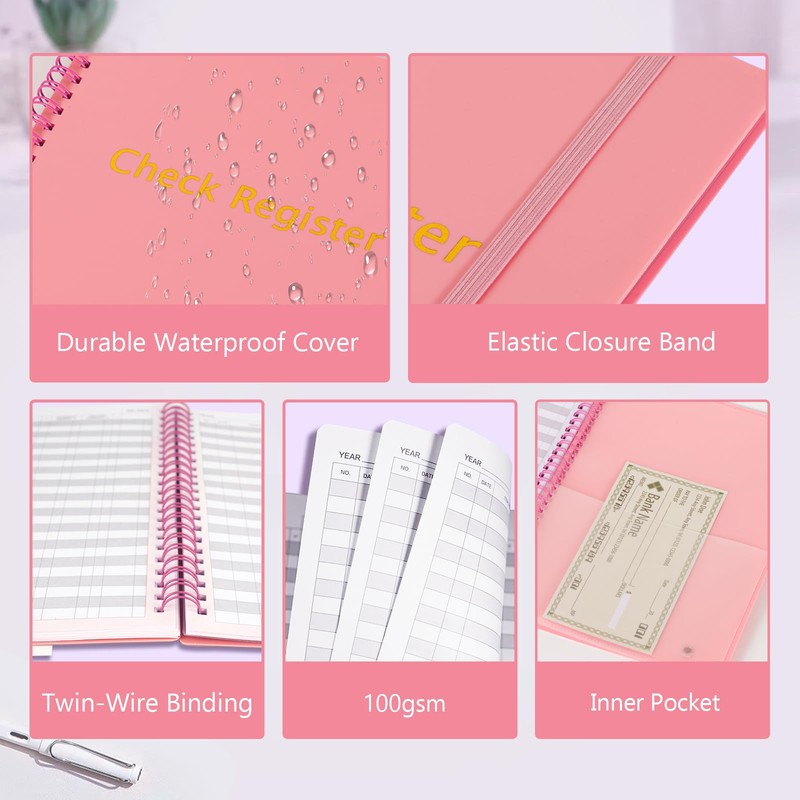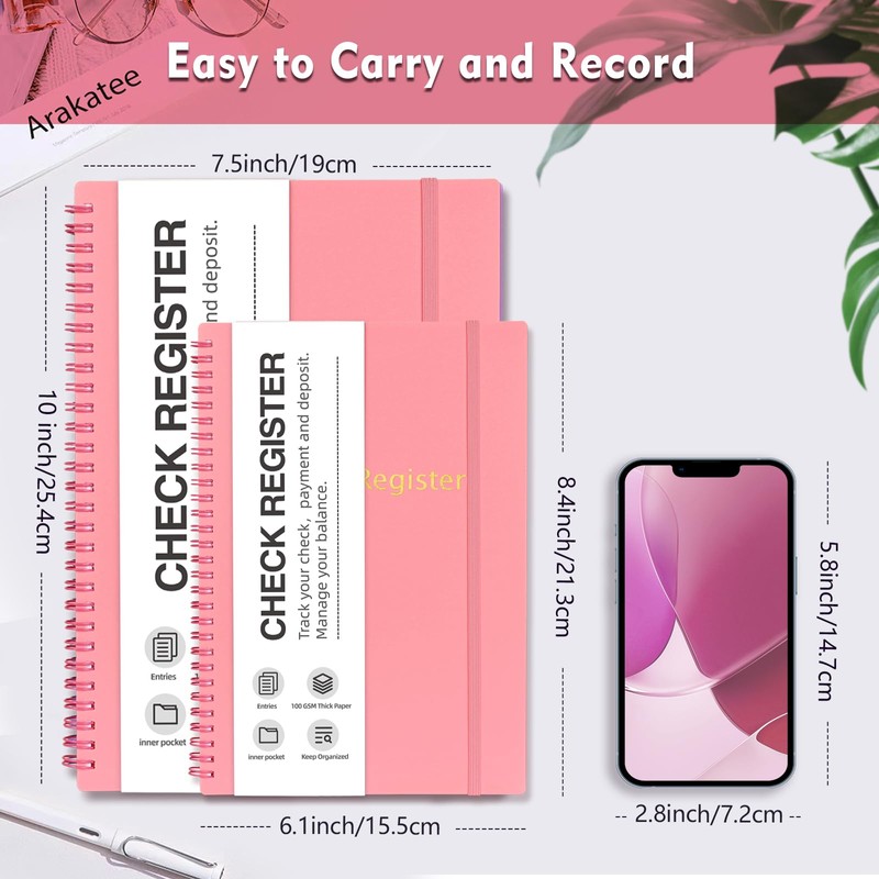 Check Registers for Personal Checkbook, Double Spiral Check Register Book, Budget Planner with Check Register for Personal and Work, 5.8'' x 8.3'' - Pink