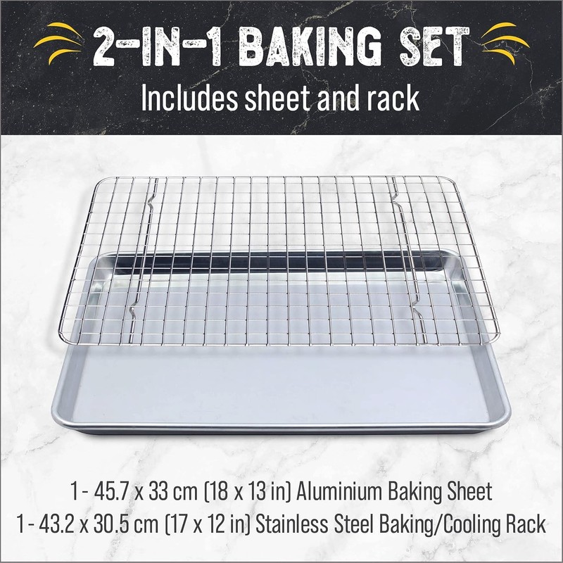- Complete Set: The perfect combo for cooking is here. Use this cookie sheet and pan rack for healthier, drip-free meals - or bake your favorite treat!
