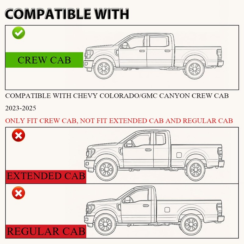 • PRECISION FIT - Compatible with Chevy Colorado Crew Cab 2023-2024. Compatible with GMC Canyon Crew Cab 2023-2024