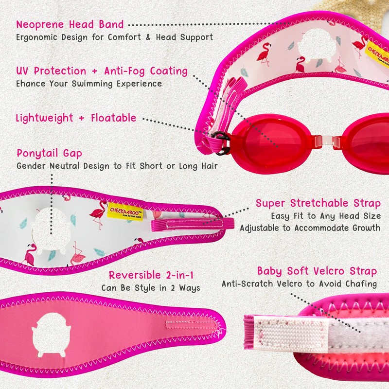 Cheekaaboo Booggles, Anti-Fog Kids Swim Goggles, Adjustable Kid and Toddler Goggles, Kids Swimming Goggles with Thick Strap Made of Neoprene Fabric, Pink/Flamingo, Fits 2-8 Years