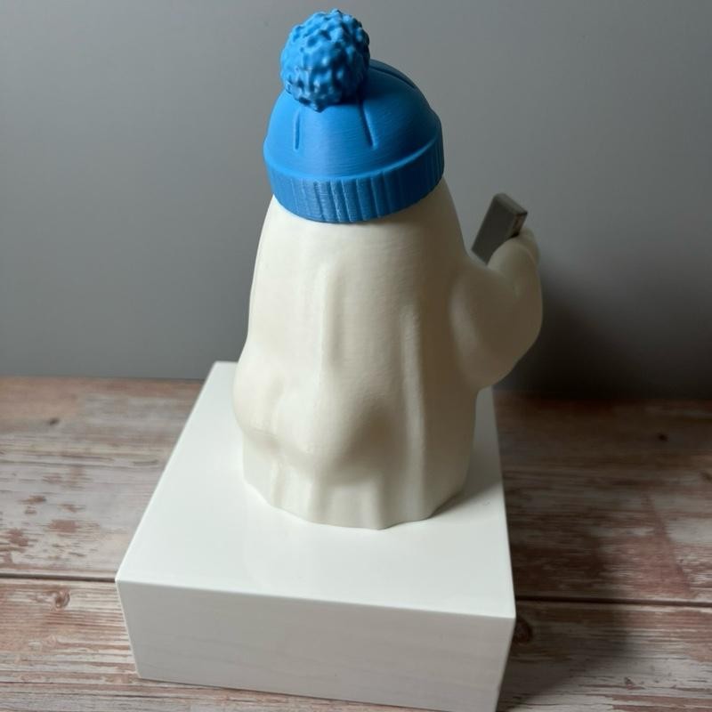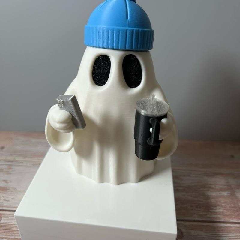 Cheeky Hipster Ghost with Tumbler Decoration | Halloween | Home | Cute | Spooky:_Light Pink Beanie_Purple Tumbler