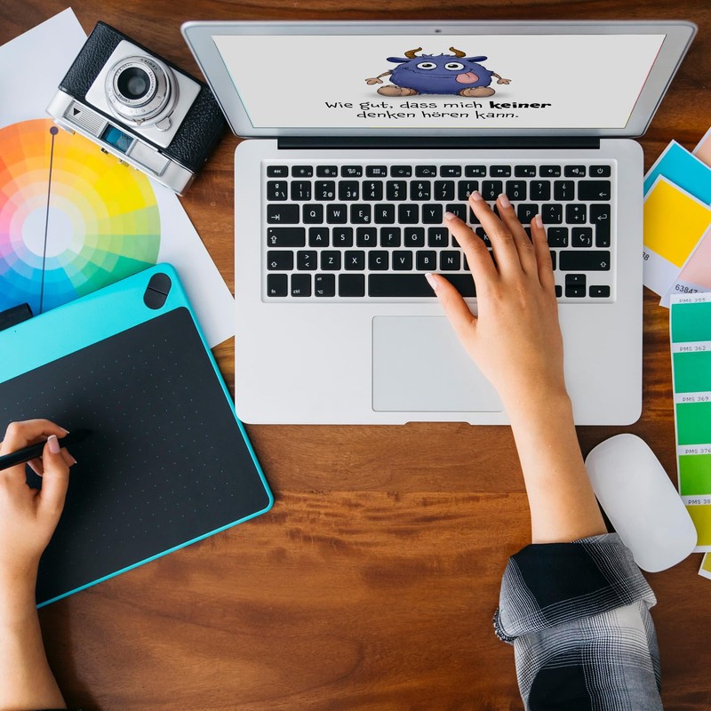- On the magnet is a monster in the colour dark blue. The monster says the following saying: Wie gut, dass keiner denken hörkann.