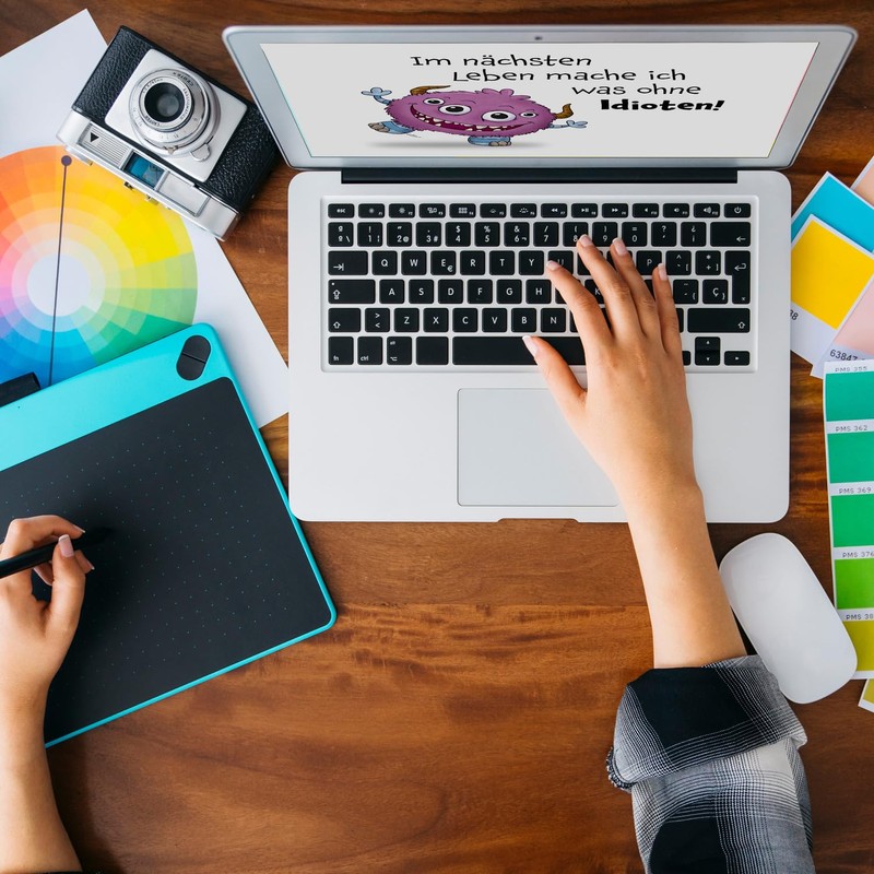 - On the magnet is a monster in the colour pink. The monster says the following saying: Im nächsten Laben mache ich was ohne Idioten!