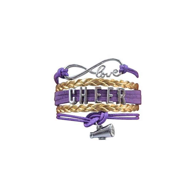 - * CHEERLEADERS, will adore this pretty infinity wrap bracelet featuring purple and gold strands for a unique handmade look. Sporting an infinity symbol with the word “Love” in it and the word Cheer in moveable letters, it features a silvery megaphone charm. Packaged in Sportybella branded packaging.