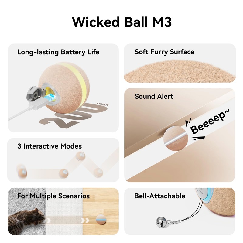 - Find & Low Battery Alerts: Wicked Ball M3 features a short 'beep' sound that activates when the battery is low or after 10 minutes of inactivity. This ensures you can easily locate the ball and keeps your pet's playtime uninterrupted.