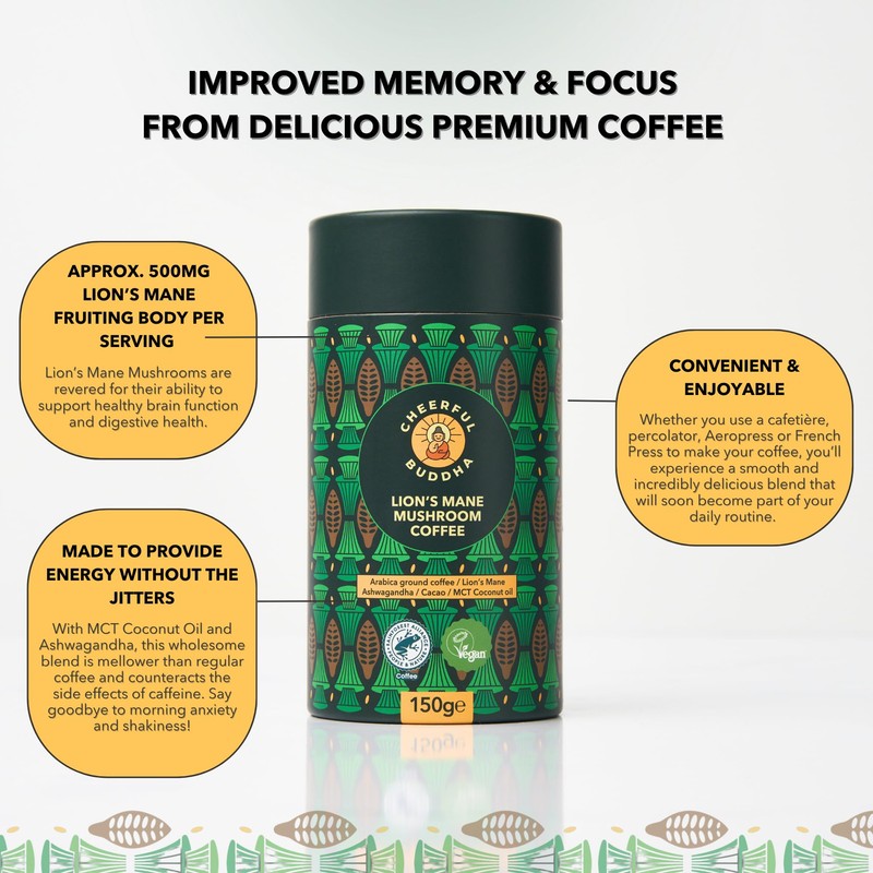 - THE PERFECT BEVERAGE - Cheerful Buddha’s exciting new mushroom blend coffee range combines 100% healthy ingredients with our luxury Colombian Arabica blend to create the perfect beverage.